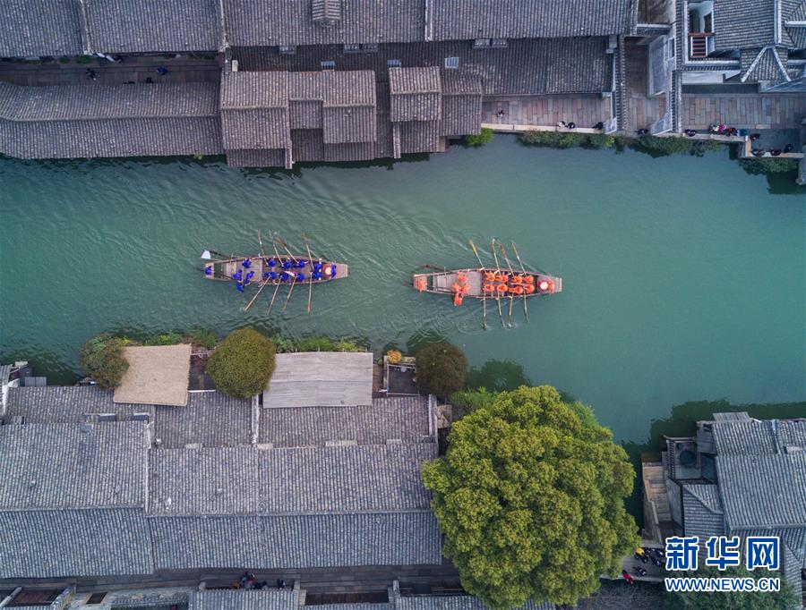 3月29日,烏鎮(zhèn)水鄉(xiāng)百姓在烏鎮(zhèn)西柵景區(qū)參加名為“踏白船”的傳統(tǒng)水上競技活動,吸引游客前來感受水鄉(xiāng)獨特的民俗風情?!疤ぐ状备傎惖哪康氖菫榱似砬笮Q桑豐收。