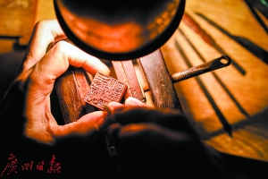 顧名思義,疊字印就是在印章的字上再刻字,下面的字細(xì),上面的字粗?!翱桃粋€(gè)疊字印要兩天,如果是比賽的話,一個(gè)小時(shí)左右就能搞定?!表?xiàng)頌秋說(shuō)。
