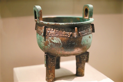 在此次展出的青銅器中,有一部分是僅銘有族氏銘文的,即家族的名號,以表示是該物品的所屬人。代表族徽的銘文,象形的程度會比較高,主要用作禮器。比如展出的鳥父甲鼎,內(nèi)里的銘文就是自上而下三個字,其中“鳥”字則幾乎完全是鳥的象形,這個鳥就是鳥族的族徽,鳥族族群在當(dāng)時十分龐大。而后面兩個字就是“日名”,日名是指古人對逝人的稱謂,一般以甲乙丙丁戊己庚辛壬癸十天干前加上受祭者的輩分格式出現(xiàn)。這種禮器又叫做日名器,既點(diǎn)明了受祭者,又表明了作器者和受祭者的關(guān)系。