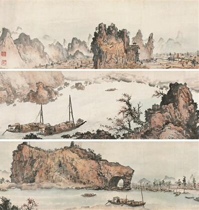 關于長卷《漓江百里圖》。他意味深長地回顧說:“是年秋我從韶關到了桂林,得阮退之推薦,認識李焰生,經其介紹,住進七星巖公寓舊房子,家具十分簡陋,只有一張二尺多長,一尺多寬的小桌子,勉強可以畫些小品之類,根本無法展開畫大幅。我欠房東錢,他幫我擔保,后又被邀住進其家。幸得可以在其家廳中的八仙桌上作畫,而作長卷則只好蹲或趴在地下屈就。我日夜不停,苦戰(zhàn)了近兩月,終于完成《漓江百里圖》。我將其放在桂林的第一次畫展中展出。畫展結束,我把小幅畫出賣,權作生活費。但此長卷則隨身攜帶。1942年在四川樂山展出時,武漢大學教授吳其昌先生觀后扶病題跋。1980年我請榮寶齋張貴桐老師傅將長卷和題跋精裱,合二而一,永存紀念。”可見關老對此長卷之珍愛!