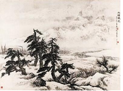 據(jù)介紹,《北國風光》既有著關山月招牌的寫實之風——將筆情墨趣融進寫生之中,又表現(xiàn)了毛澤東詞作《沁園春·雪》的浪漫豪放。一如與傅抱石合作的《江山如此多嬌》,關山月在該畫中采用了更博大豪邁的橫幅構圖。西畫中的焦點透視法在此幅中非常精彩而寫實地表現(xiàn)了遠中近處的景觀:近處,荒原上的尚未融化的白雪,挺立其上的幾顆老松,與《江山如此多嬌》中前景的松樹一樣,畫家以長期歷練的寫實手法表現(xiàn)松之偉岸雄厚和不畏嚴寒,躍然而出的是一種英雄浪漫主義情懷。至于遠山和云海,畫法與《江山如此多嬌》中的遠山云海如出一轍,畫法甚至更為成熟,也更為瀟灑。