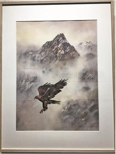 雄鷹展翅翱翔、盤旋于海灣、高山的上空,這是蔣燁教授水彩畫中的場(chǎng)景。概括凝練的風(fēng)景,氣度非凡的飛鷹,一動(dòng)一靜間把融合中國傳統(tǒng)文化的現(xiàn)代水彩語境表現(xiàn)得酣暢淋漓。開幕當(dāng)天,蔣燁將畫作《?!棥焚?zèng)送給了龍崗區(qū)人民政府。