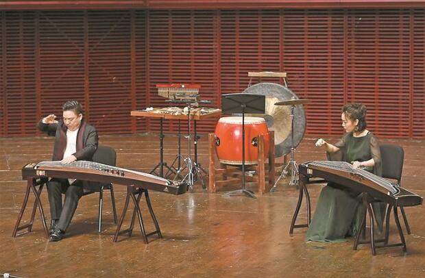 葉小綱創(chuàng)作的古箏獨(dú)奏曲《林泉》,可謂清新脫俗,奔涌跌宕,用多種創(chuàng)作手段和高難的演奏技法,將自然界晦明更迭、晴雨接踵、清泉潺潺、惡風(fēng)獵獵的生動(dòng)景象加以細(xì)致描摹,給古箏的藝術(shù)表現(xiàn)帶來(lái)更多的可能性。宋心馨功底好,善表演,表現(xiàn)出人琴合一、情音互融的美好意象。筆者這一代愛(ài)樂(lè)者大都聽(tīng)過(guò)劉文金的二胡名曲《豫北敘事曲》,此次演奏的是這位民樂(lè)大師生前創(chuàng)作的無(wú)伴奏二胡二重奏《火·彩衣姑娘》。劉老此曲一改長(zhǎng)期延用的傳統(tǒng)路線而風(fēng)格大變,透露其晚年依然旺盛的創(chuàng)新活力。宋飛師徒身著紫、青兩色連衣裙玉立演奏,“風(fēng)吹仙袂飄飄舉”,細(xì)膩呈現(xiàn)出此曲熱烈、浪漫、溫柔、含蓄的豐富層次,從作品到臺(tái)容都給人全新的藝術(shù)感受。