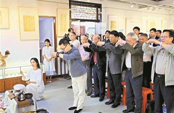 絲竹管弦伴著《詩經(jīng)》吟誦,古雅之風(fēng)貫穿了古今。當(dāng)天除了慕雅思古之外,亦有崇賢。參加活動(dòng)的眾人,向書圣王羲之的畫像作揖、致敬。羅烈杰、盧紹武、李靜現(xiàn)場(chǎng)做了熱情洋溢的講話,他們鼓勵(lì)書界同仁要團(tuán)結(jié)努力,既要繼承傳統(tǒng)、又要推陳出新,不斷弘揚(yáng)中華民族的優(yōu)秀文化。禮畢后,著名古琴家高建國現(xiàn)場(chǎng)操琴。除此之外,還有精彩的茶藝、二胡表演等等。