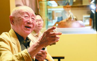 此次展覽作品以紫砂壺體為載體,借助紫砂鐫刻工藝半繪半刻,是黃永玉在創(chuàng)作媒材上又一次新的嘗試。作為書畫界有名的“90后”老頑童,在展覽開幕式上,黃永玉雖然耳朵有點背,但依然“金句”頻出,話里透著天真幽默:“一個老頭閑在家里沒事兒干,畫了一些壺。用時髦的話來講,就是行為藝術(shù)吧!”