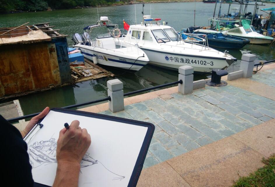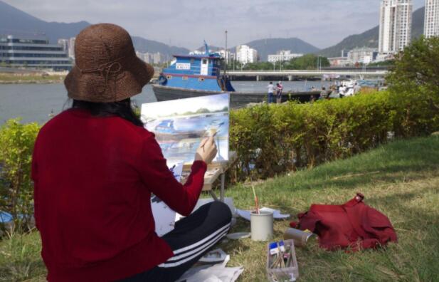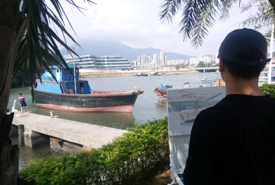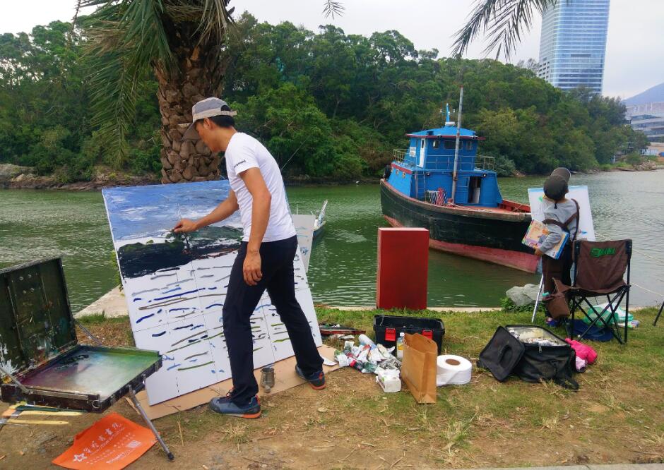 優(yōu)美的景色映入畫家們眼簾,點(diǎn)燃了他們的創(chuàng)作激情。來到鹽田之后,藝術(shù)家們紛紛找好寫生地點(diǎn),擺好畫架,迅速進(jìn)入創(chuàng)作的狀態(tài)。他們當(dāng)中一部分來到了鹽田漁港,鹽田海鮮街后的小漁村避風(fēng)港。蔚藍(lán)的大海、旁邊的綠樹、避風(fēng)塘內(nèi)停泊的船只、白色的海鳥、釣魚的人以及遠(yuǎn)方火熱的建設(shè)場景都呈現(xiàn)在畫家的筆端;另一部分藝術(shù)家來到了位于三洲田深圳會(huì)計(jì)進(jìn)修學(xué)院的梧桐溪谷,小橋流水人家、奇石山林則一一被傾注于畫紙。