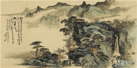 范陽(yáng)先生的山水畫(huà),筆法近取傅抱石、黃秋園,遠(yuǎn)溯“元四家”中黃公望、王蒙。筑居楊岐山下,使先生日夜親近自然山水,吐納天地,養(yǎng)浩然之氣。“外師造化,中得心源”,唐代張璪一言道破了山水畫(huà)家修養(yǎng)、悟性的不二法門(mén)。范陽(yáng)先生正是以自然(造化)為營(yíng)養(yǎng),入而為心靈化育,镕冶成亦古亦新,遠(yuǎn)離塵俗的獨(dú)特風(fēng)格。近作《松風(fēng)泉聲》(五屏聯(lián))氣勢(shì)磅礴,大開(kāi)大合,細(xì)究又十分謹(jǐn)嚴(yán)。筆墨與丘壑融為一體,既豪放又穩(wěn)健。淺絳青綠的設(shè)色,使畫(huà)面有蔥翠欲滴之感。堪稱山水畫(huà)中的經(jīng)典。