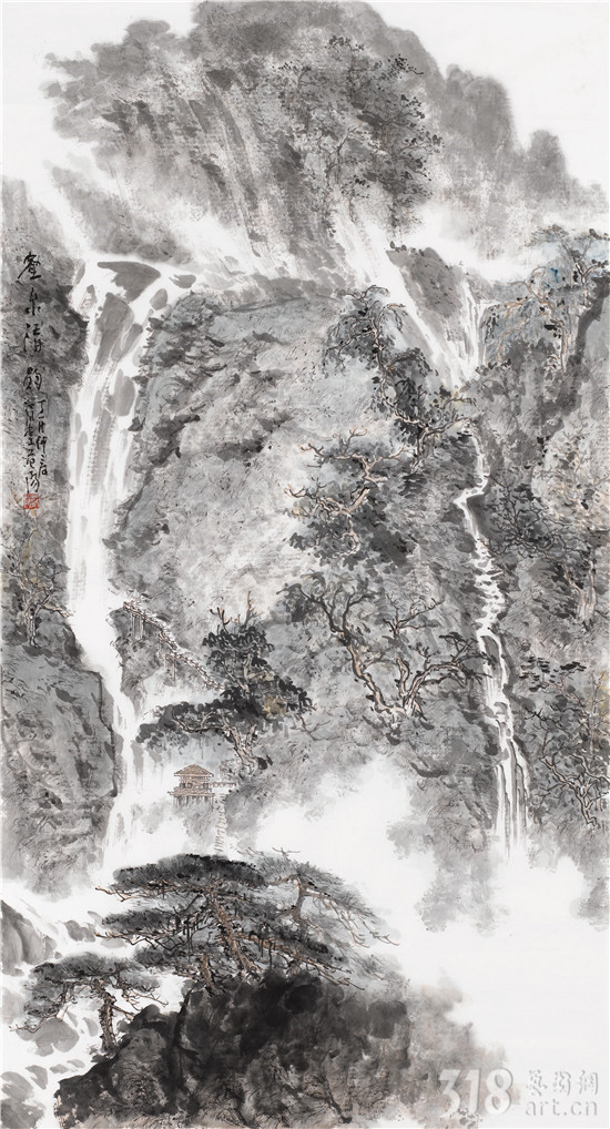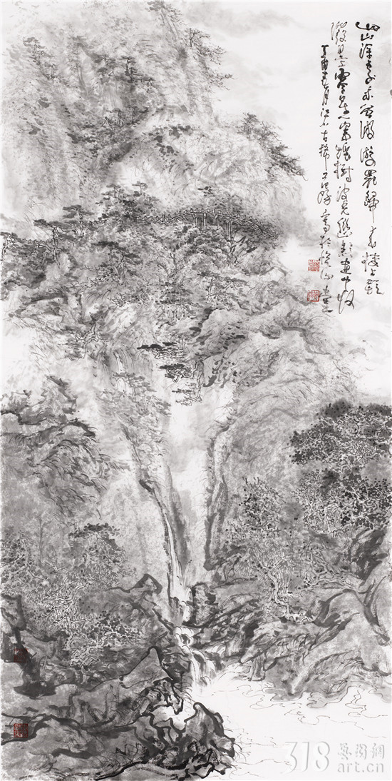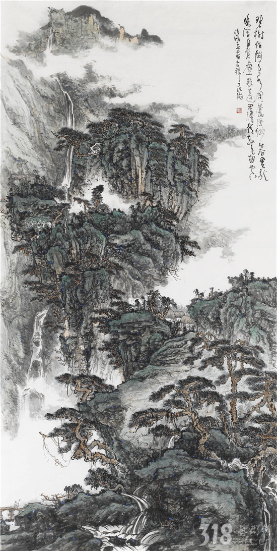 我以為,范陽(yáng)先生是真正在心性上貼近古人“不下堂筵,坐窮泉壑”,其現(xiàn)居贛中名岳武功山、楊岐山之中。尤其武功山,史上與衡山、廬山并稱江南三大名山,被冠以“衡首廬尾武功中”,山脈綿延浩瀚,茫茫無(wú)際。范陽(yáng)先生終日面山臨壑,弄筆自適,得武功真容。山水畫(huà)從來(lái)就不是簡(jiǎn)單的描摹自然的風(fēng)光,無(wú)論丘園養(yǎng)素還是泉石嘯傲,都是畫(huà)者精神的自然流露,這是畫(huà)家筆墨情態(tài)的表達(dá),亦是畫(huà)家藝術(shù)境界追求的體現(xiàn)。對(duì)于山林的描繪,承載了畫(huà)者對(duì)泉石意趣的向往,對(duì)于林下境界的追求。范陽(yáng)先生的山水畫(huà)作品長(zhǎng)于布景,對(duì)山中的“陰、晴、朝、夕”的細(xì)膩描繪都有他自已獨(dú)特感悟和表達(dá)。筆下極丘壑浩渺之勢(shì),奇峰羅列,宛有風(fēng)骨,深壑幽谷,其勢(shì)超峻;至于松柏掩映,峭壁涌泉,野道幽麓,于野逸之態(tài)甚備。范陽(yáng)先生數(shù)十年來(lái)遍臨南北宗諸家,遠(yuǎn)溯元人四家,清初四王,近至黃秋園,上下求索,崇穆有加,最終歸皈真逸正脈。新近年逾七十之作,日漸精熟,蒼腴古厚,更趨融古化古之態(tài),細(xì)究其筆下蹤跡:子久?麓臺(tái)?秋園?各不相肖,而莫不精備。諦觀其中景象:匡廬?武功?羅霄?渾然而化,不一而足。如此境地當(dāng)稱“妙解”。