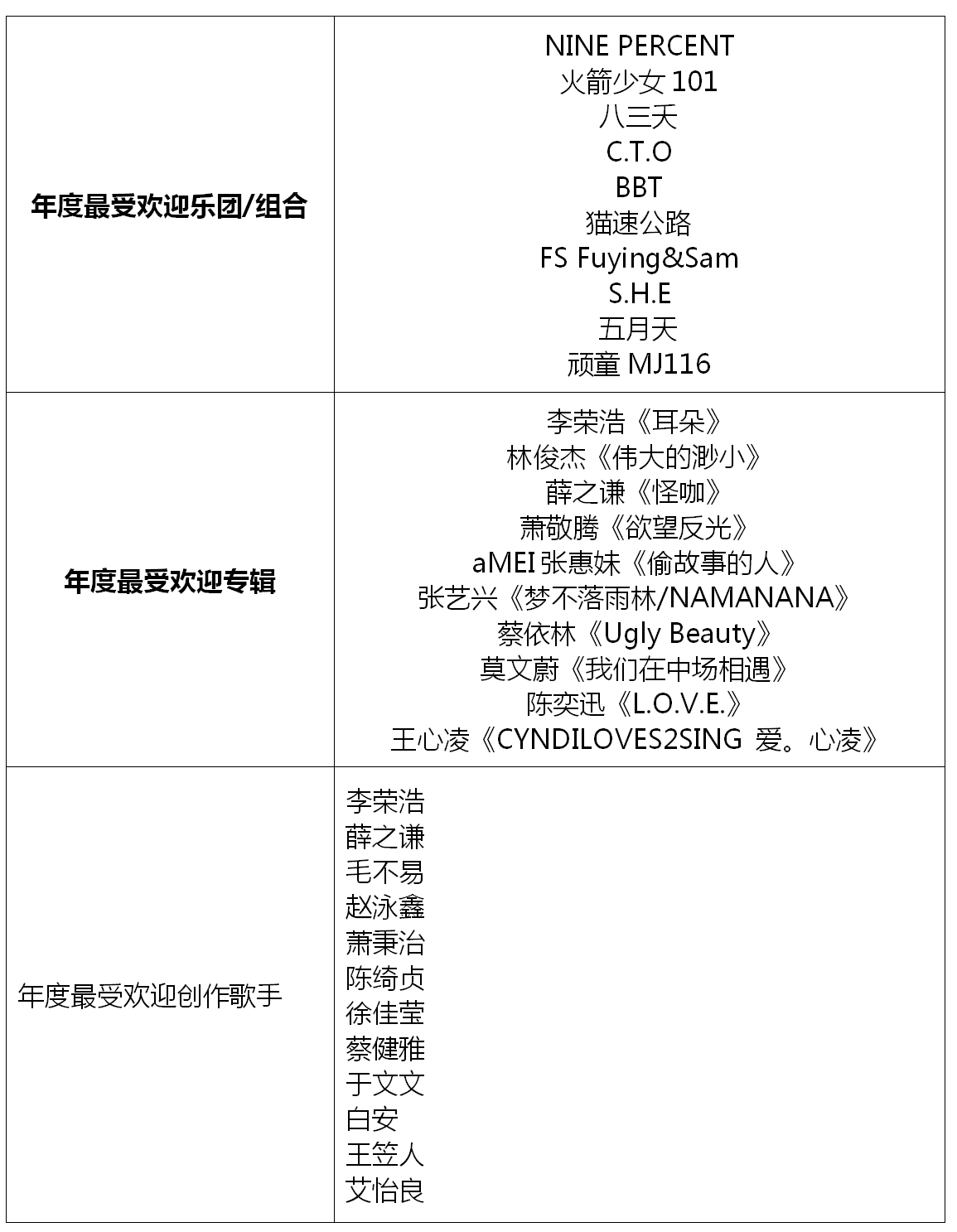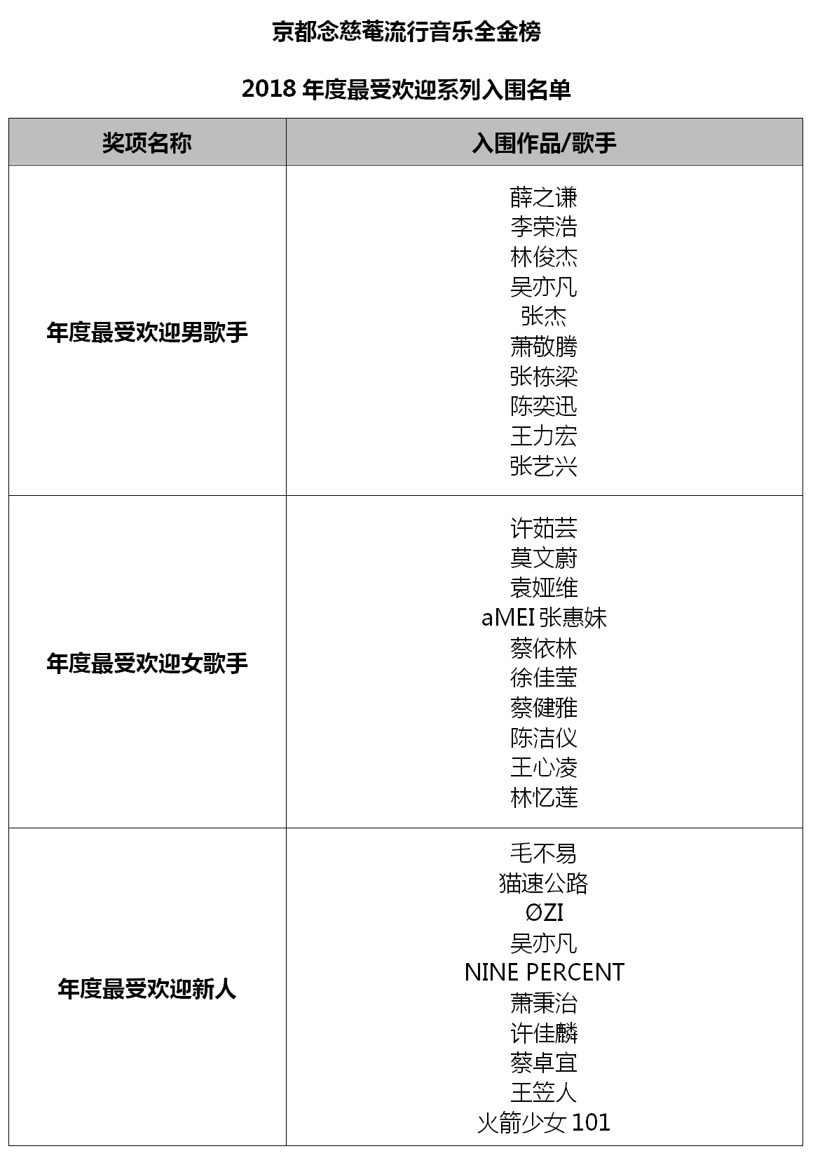 “年度最受歡迎樂隊(duì)/組合”入圍名單中,同在2018年成功舉辦巡回演唱會(huì)的五月天、S.H.E等老牌組合的進(jìn)榜,讓大家看到了華語樂壇常青樹的非凡音樂實(shí)力;八三夭、C.T.O、BBT、FS Fuying&Sam、頑童MJ116等組合,憑借不減反升的人氣魅力實(shí)力進(jìn)榜;而NINE PERCENT、火箭少女101及貓速公路等新人組合的二次入圍,不僅僅是對他們在音樂成績上的肯定,更是對其未來之路的鼓勵(lì)。