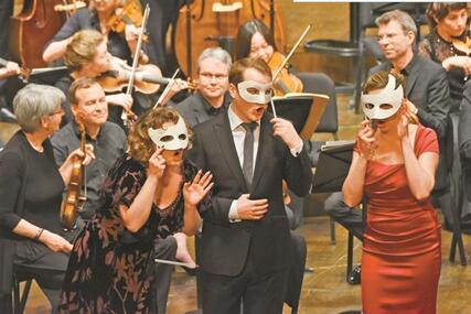 經(jīng)過對(duì)歌劇《唐璜》的嚴(yán)謹(jǐn)考證,勒內(nèi)·雅各布斯以鮮活的“古樂”形式還原了早期古典主義歌劇的音樂特質(zhì)。據(jù)凱撒介紹,昨晚的演出與以往歌劇表演有很大不同。音樂會(huì)版的歌劇《唐璜》中,樂團(tuán)、指揮、獨(dú)唱與合唱團(tuán)都在舞臺(tái)上,演員不僅會(huì)在臺(tái)前演唱,還穿梭在樂團(tuán)中,帶來生動(dòng)的演出。