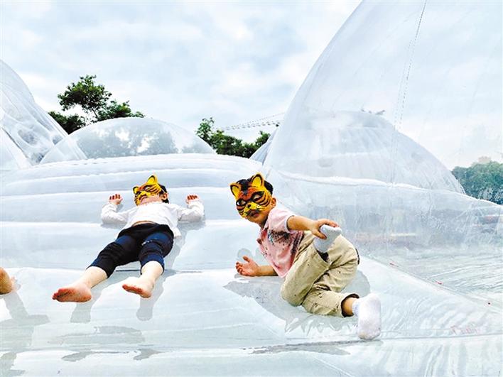 在本屆鳳凰花嘉年華主會(huì)場(chǎng)——華僑城體育文化中心綠地空曠自然的草坪上,由本土新銳建筑設(shè)計(jì)師黃澤林設(shè)計(jì)和創(chuàng)作的巨型充氣建筑“空氣山”拔地而起。人們可以自由地在“空氣山”的多維表面上嘗試坐、臥、立、躺的體驗(yàn)。而張凱琴、張齊努、劉小青三位國(guó)內(nèi)知名自然藝術(shù)家即興創(chuàng)作的“歇腳云”等自然裝置,通過(guò)空間藝術(shù)作品與公眾的互動(dòng),喚醒著人們對(duì)自然的熱愛(ài)。