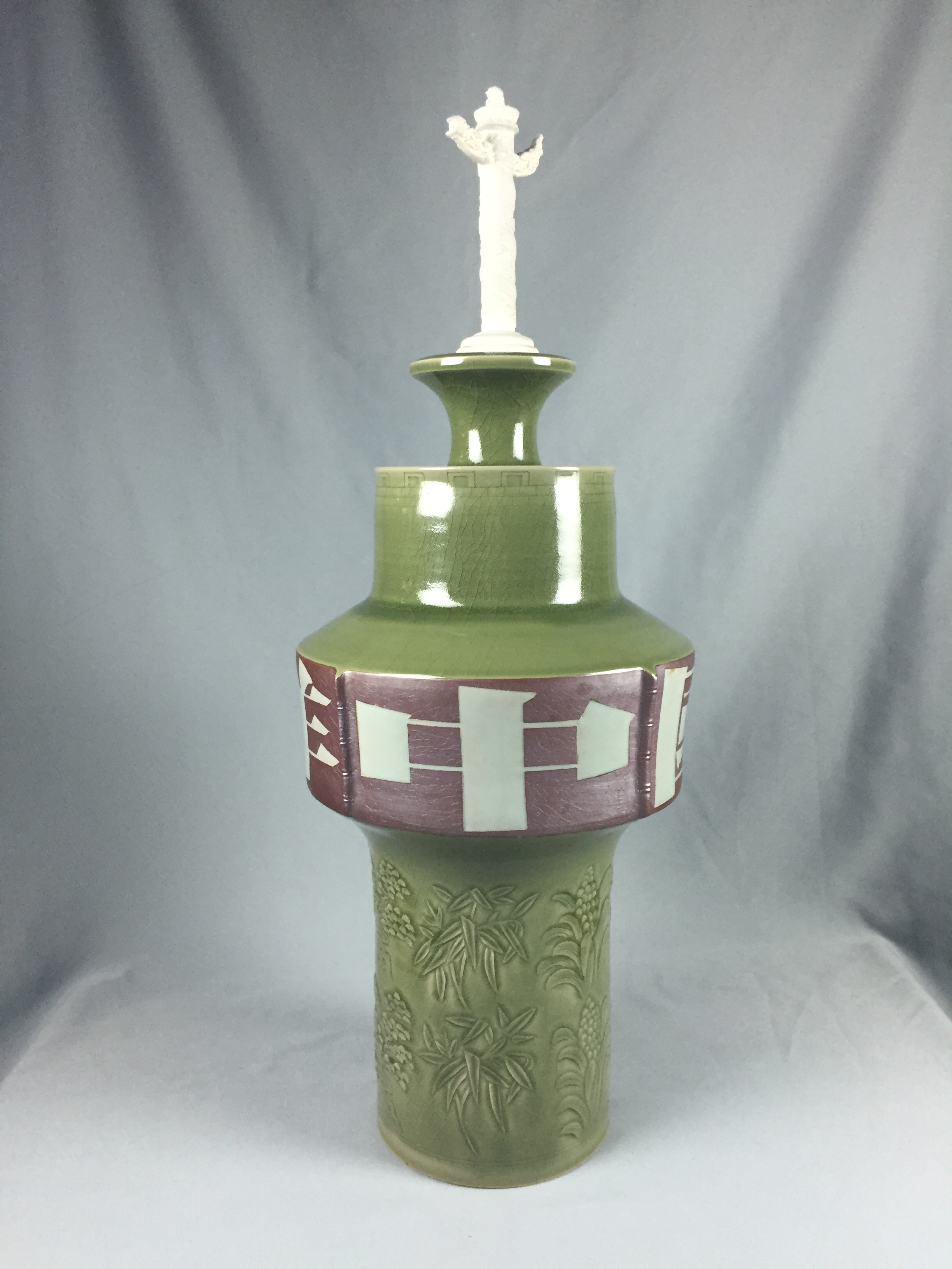 此次參與展出的青瓷作品中,一件名為“紅底玉縷耀瓷刻花松竹萬年青紋中國吉祥”的青瓷作品人氣頗高。據(jù)介紹,此件作品由中國工藝美術(shù)大師孟樹鋒親自制作。作品整體呈現(xiàn)“中”字造型,偉岸挺拔,雄渾方正,險(xiǎn)峻奇特而大氣磅礴。瓶頂一尊華表,白泥素胎,一如漢白玉石雕。瓶肩梢高凸又微微外撇,是一圈五十六個(gè)垛峰與垛口的萬里長(zhǎng)城,代表著中國五十六個(gè)民族團(tuán)結(jié)一心。其下碩腹,則使用耀州紅底玉縷的工藝書寫“中國吉祥”四個(gè)雕版大字,點(diǎn)明作品主題。下部立柱上刻、劃、貼花的萬年青、青松、竹子,體現(xiàn)耀州瓷的風(fēng)格并以此祝福祖國。