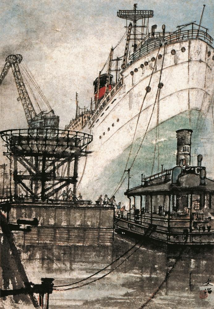 宋文治對廣東地區(qū)的關注始于20世紀的60年代。他在1960年參加江蘇國畫院組織的行程二萬三千里的寫生活動中,經過廣州時就創(chuàng)作了《廣州造船廠》,罕見地運用山水畫技法表現(xiàn)現(xiàn)代工業(yè)題材。