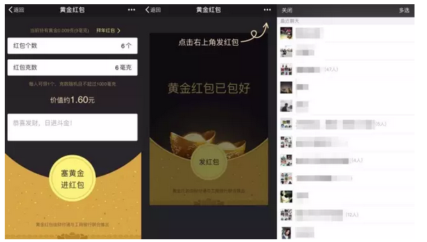 發(fā)紅包的人不再發(fā)送現(xiàn)金紅包,而是發(fā)送以黃金為主體的紅包,以毫克為單位計算……黃金紅包價值會隨著微黃金價格波動,微黃金報價跟蹤上海黃金交易所價格浮動。收到黃金紅包的人實質(zhì)持有的為計量的黃金,并且可以根據(jù)當前金價將其變現(xiàn)。