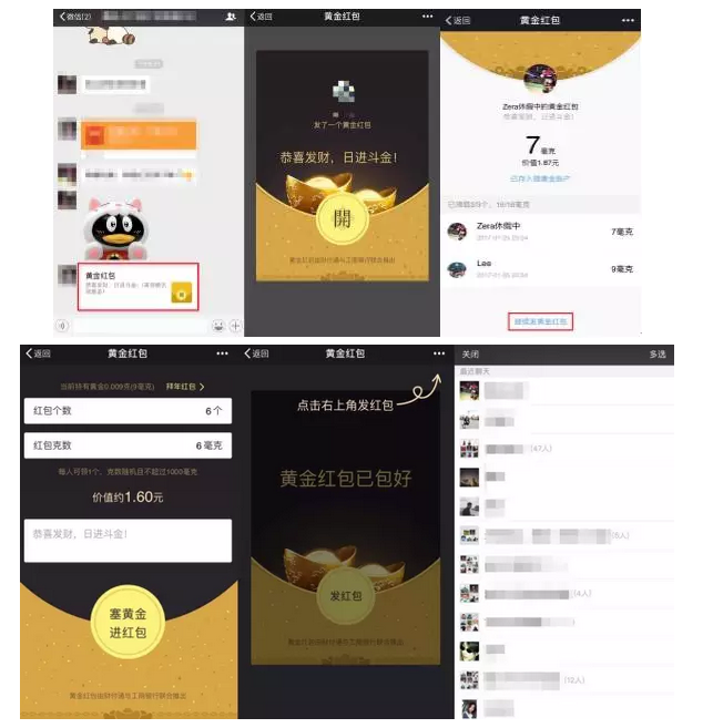 2017年春節(jié),工行攜手騰訊一起嘗試讓大家可以“發(fā)金子”,把大家熟悉的“紅包“與“過年添金”的習俗融合起來,邀請部分用戶來體驗一種新的玩法——黃金紅包,讓新的一年更“金”彩。