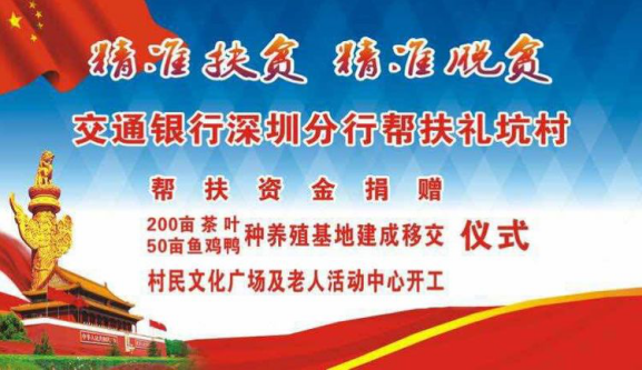 自交通銀行深圳分行對(duì)口幫扶禮坑村,開展"雙精準(zhǔn)"扶貧以來,禮坑的經(jīng)濟(jì)社會(huì)發(fā)展和村容村貌發(fā)生顯著變化,積貧積弱的小山村呈現(xiàn)欣欣向榮的新氣象。積土成山、積水成淵,200畝茶山破土而出、蔚然成綠,50畝養(yǎng)殖基地竣工落成、生機(jī)勃勃,三萬魚苗、數(shù)千雞苗茁壯生長(zhǎng),村民文化廣場(chǎng)、老年活動(dòng)中心、道路硬底項(xiàng)目、山村亮燈工程躍然紙上,逐次開工建設(shè),禮坑正創(chuàng)造并綻放新的希望,村民笑容淳厚,各級(jí)由衷點(diǎn)贊。紫金縣領(lǐng)導(dǎo)、縣扶貧工作總負(fù)責(zé)人廖振輝表示:"交通銀行深圳分行是真重視、真扶貧、扶真貧,在對(duì)口紫金的扶貧單位中首屈一指,無論在河源市的扶貧工作考評(píng)中,還是在代表河源參加的廣東省扶貧工作考評(píng)中,雙雙獲得優(yōu)秀評(píng)價(jià),真誠(chéng)感謝交行,紫金要和交行一起努力,讓禮坑成為社會(huì)主義新農(nóng)村示范村建設(shè)中的示范點(diǎn)"。