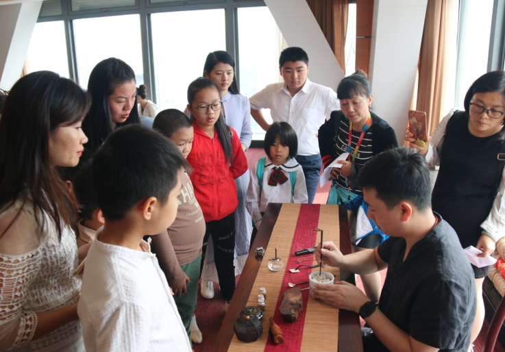 在現(xiàn)場,此次展覽的合作方——上海雍荷堂香館和深圳望野博物館呈現(xiàn)了數(shù)十件珍稀沉香藝術(shù)品和館藏香器珍品。來自深圳望野博物館的程海龍老師和上海雍荷堂香館的湯益強(qiáng)老師分別給小記者們現(xiàn)場講解了參展文物的歷史和相關(guān)知識(shí),同時(shí)湯益強(qiáng)老師還給小記者們做了傳統(tǒng)的香道技藝表演。