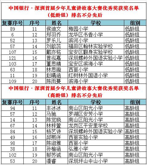 從全市近百所學(xué)校、社會賽區(qū)報名的萬余名參賽選手中脫穎而出的選手們齊聚復(fù)賽賽場,比賽競爭異常激烈。晉級復(fù)賽的225人(其中高齡組104人,低齡組121人)使出渾身解數(shù),講述著自己喜歡的故事,最終高、低齡組每組各10人晉級決賽,低齡組新蓮小學(xué)施詩彤、鹽田區(qū)外國語小學(xué)申旸等10位選手,高齡組弘雅小學(xué)尹琪善、福田區(qū)翰林實驗學(xué)校劉馨竹等10位選手“殺出重圍”,奪得決賽名額。