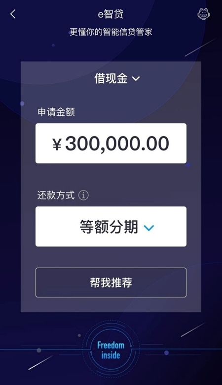 全新升級(jí)Freedom引擎后的e智貸,借助其自身的Freedom核心推薦的強(qiáng)大功能,通過(guò)極速的信息搜集和計(jì)算,可秒級(jí)判斷可貸額度,并為客戶(hù)量身推薦e招貸、e閃貸、分期還款等多種產(chǎn)品。