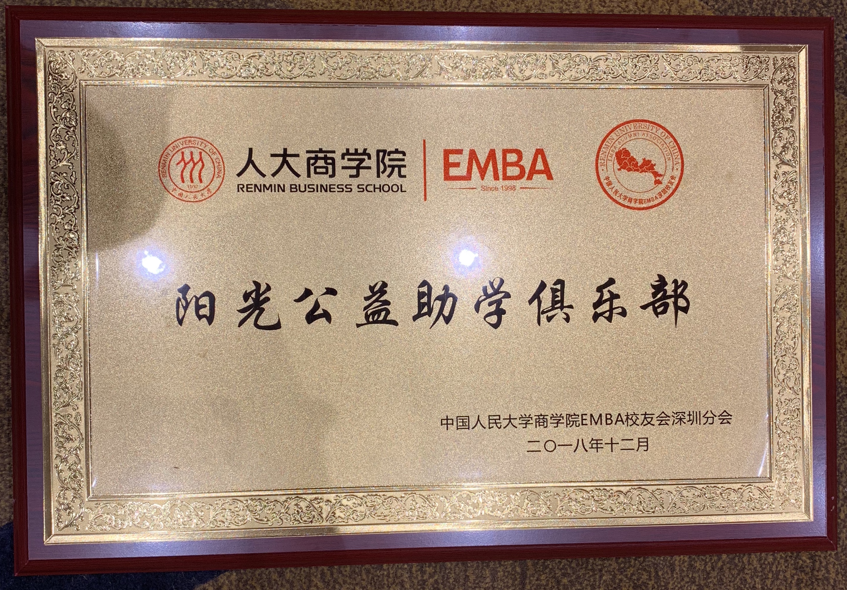018年12月15日,在深圳舉行的中國(guó)人民大學(xué)EMBA深圳校友會(huì)迎新會(huì)上,中國(guó)人民大學(xué)EMBA“陽(yáng)光公益助學(xué)俱樂(lè)部”終于等來(lái)了出生證——秘書(shū)長(zhǎng)樓蓉代表公益助學(xué)俱樂(lè)部接受中國(guó)人民大學(xué)商學(xué)院毛基業(yè)院長(zhǎng)的授牌。