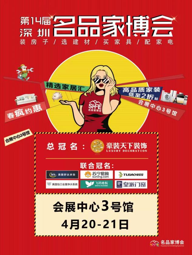 由豪裝天下裝飾集團(tuán)總冠名并聯(lián)合蘇寧易購(gòu)、美國(guó)舒達(dá)床墊、飛鴿地板、皇派門窗共同助力的第14屆深圳名品家博會(huì),將于4月20日—21日舉行在深圳會(huì)展中心舉辦。千余個(gè)家居一線品牌、萬(wàn)余款家裝大牌產(chǎn)品齊聚本屆深圳家博會(huì),將為深圳數(shù)萬(wàn)裝修家庭帶來驚喜與福利。