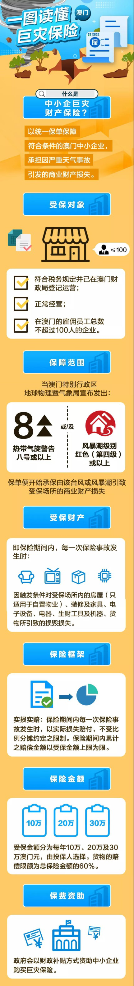 7月31日,今年首個(gè)臺(tái)風(fēng)“韋帕”來襲,香港、澳門氣象部門相繼懸掛8號(hào)風(fēng)球,并發(fā)布黃色風(fēng)暴潮警告。在持續(xù)強(qiáng)降雨和大風(fēng)之際,澳門金融管理局和經(jīng)濟(jì)局舉行聯(lián)合新聞發(fā)布會(huì),宣布推出“中小企巨災(zāi)財(cái)產(chǎn)保險(xiǎn)”,為中小企業(yè)在8號(hào)風(fēng)球/紅色風(fēng)暴潮或以上警告期間,所遭受的商業(yè)財(cái)產(chǎn)損失提供保險(xiǎn)保障。中國(guó)太平旗下太平澳門簽出中小企巨災(zāi)財(cái)產(chǎn)保險(xiǎn)第一單,為當(dāng)?shù)刂行∑髽I(yè)帶來定心丸。
