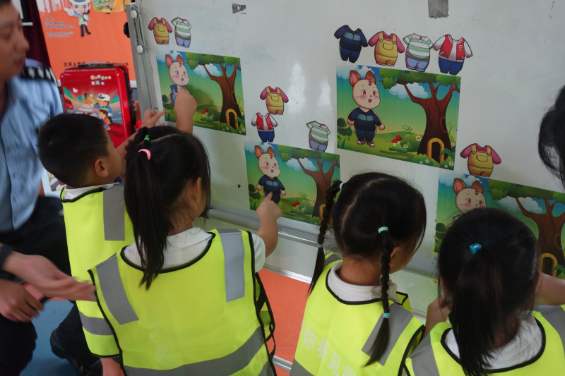 熊警官?gòu)慕煌üぞ咧v起,分別講述了乘坐不同交通工具所帶來(lái)的風(fēng)險(xiǎn)及注意事項(xiàng),并通過(guò)幽默風(fēng)趣的“兒童安全座椅”小視頻,提醒在座的小朋友及家長(zhǎng)要注意細(xì)節(jié),具有防范風(fēng)險(xiǎn)的意識(shí)。在互動(dòng)游戲環(huán)節(jié),熊警官通過(guò)與小朋友們的互動(dòng),講解了紅綠燈的來(lái)源、日常的交通標(biāo)識(shí)以及過(guò)馬路的規(guī)則?,F(xiàn)場(chǎng)的同學(xué)們也非常踴躍,在“被看見才安全”環(huán)節(jié)時(shí),許多小朋友主動(dòng)上臺(tái),給小兔子穿上最亮最顯眼的衣服,使其成為最靚的仔。