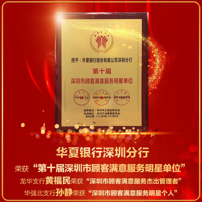 深圳新聞網(wǎng)訊 近日,華夏銀行深圳分行在“第十屆深圳市顧客滿意服務(wù)明星”暨“第二屆深圳市優(yōu)質(zhì)服務(wù)示范單位”評(píng)選活動(dòng)中,榮登“深圳市顧客滿意服務(wù)明星單位”榜首,“華夏服務(wù)”品牌影響力再次得到行業(yè)和客戶的高度認(rèn)可。同時(shí),該行龍華支行行長(zhǎng)黃福民、華強(qiáng)北支行副行長(zhǎng)孫靜分別獲得“深圳市顧客滿意服務(wù)杰出管理者”和“深圳市顧客滿意服務(wù)明星”榮譽(yù)稱號(hào)。
