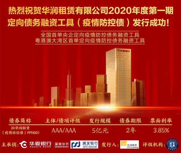2月28日,由華夏銀行深圳分行主承銷的華潤租賃有限公司2020年度第一期定向債務融資工具(疫情防控債)成功發(fā)行。