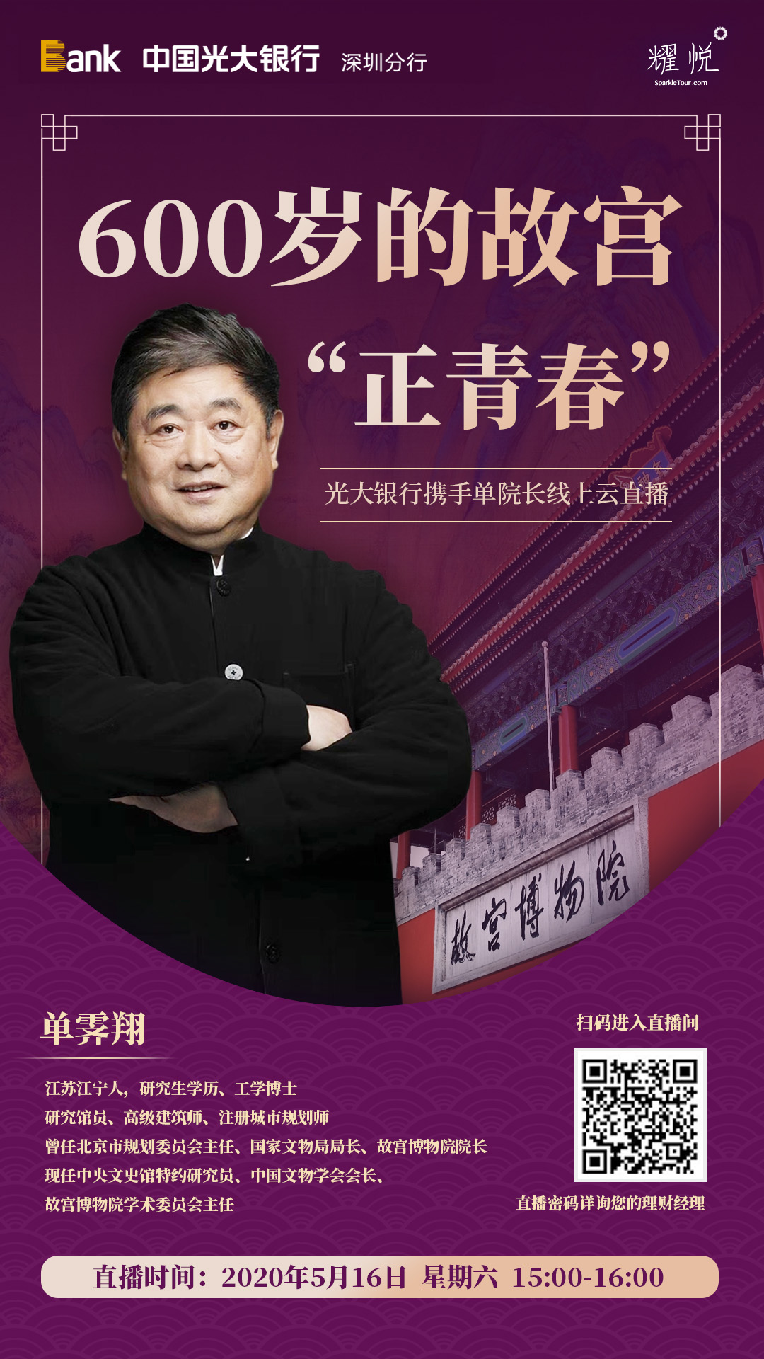 深圳新聞網(wǎng)2020年5月15日訊 他要來(lái)了,帶著600歲故宮的青春故事來(lái)了,來(lái)到《光大銀行“開(kāi)講啦”!》第十二期。為了回饋客戶,讓廣大客戶更深入體會(huì)到故宮之美,光大銀行深圳分行特邀請(qǐng)?jiān)蕦m博物館單霽翔院長(zhǎng),于5月16日(周六)下午3點(diǎn)-4點(diǎn)線上開(kāi)講精彩課程《600歲的故宮“正青春”》,讓參與者從多個(gè)角度體驗(yàn)傳統(tǒng)文化之美。