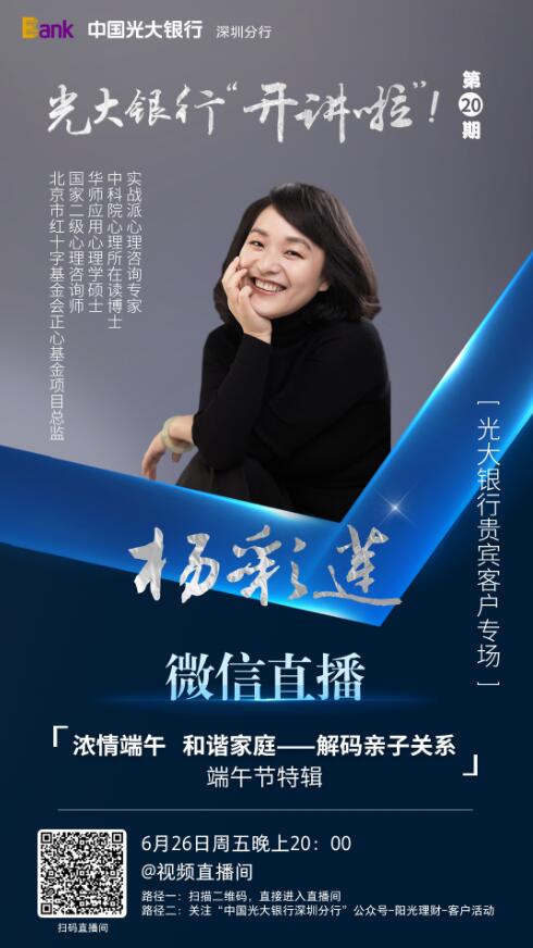 端午節(jié)臨近,光大銀行深圳分行將攜手深圳熱線于6月26日,在線開展第二十期《光大銀行"開講啦“!》公益課堂。