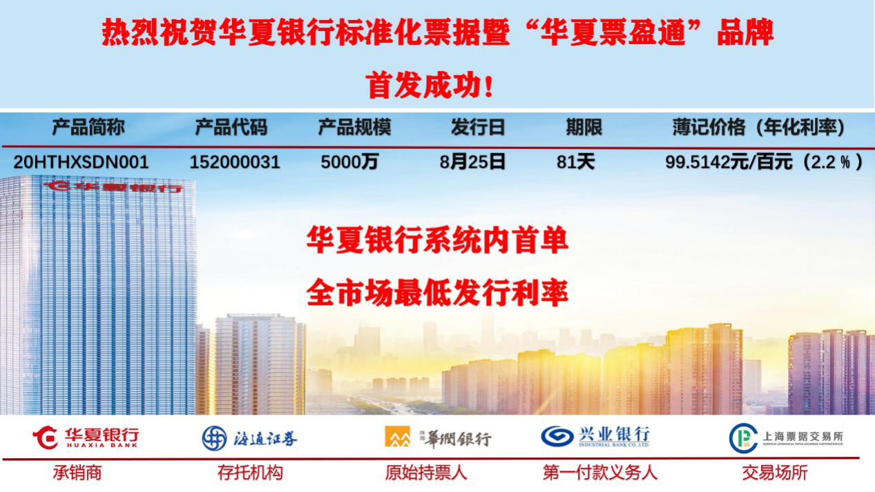 深圳新聞網(wǎng)·見圳客戶端2020年8月25日訊 今日,在深圳特區(qū)成立40周年來臨之際,記者從華夏銀行深圳分行獲悉,由該行承銷的海通證券華夏票盈通2020年度第一期標準化票據(jù)產(chǎn)品(產(chǎn)品簡稱:20HTHXSDN001)在該行系統(tǒng)內(nèi)率先成功發(fā)行。本期標準化票據(jù)發(fā)行規(guī)模5000萬,簿記價格99.5142元/百元面值(相當于年化利率2.2%),發(fā)行利率創(chuàng)全市場可比同類型、同期限產(chǎn)品新低,將以更低的融資成本支持“穩(wěn)企業(yè)保就業(yè)”工作。