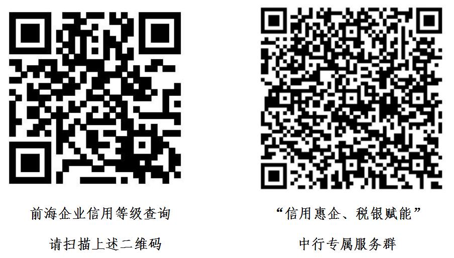 前海注冊企業(yè)可通過下左二維碼查詢前海信用等級,可通過下右二維碼加入“信用惠企、稅銀賦能”中行專屬服務(wù)群(入群請備注企業(yè)名稱),了解咨詢深圳中行針對前?!氨趟{(lán)企業(yè)”和“湛藍(lán)企業(yè)”的十項(xiàng)具體服務(wù)內(nèi)容。(黃璜)