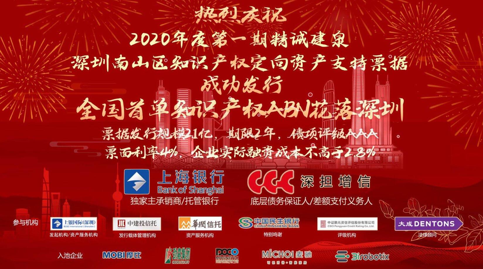 深圳新聞網(wǎng)·見圳客戶端2020年9月23日訊 昨日,隨著上海銀行股份有限公司主承的“上銀國(guó)際投資(深圳)有限公司2020年度第一期精誠(chéng)建泉深圳南山區(qū)知識(shí)產(chǎn)權(quán)定向資產(chǎn)支持票據(jù)”成功發(fā)行,中國(guó)銀行間交易商協(xié)會(huì)首單民營(yíng)科技中小企業(yè)專項(xiàng)知識(shí)產(chǎn)權(quán)ABN項(xiàng)目花落深圳。該項(xiàng)目不僅是對(duì)知識(shí)產(chǎn)權(quán)證券化的一次創(chuàng)新和實(shí)踐,也為中小民營(yíng)科技企業(yè)開辟了一條在銀行間市場(chǎng)融資的新渠道。本期ABN共五家入池企業(yè),發(fā)行規(guī)模2.1億元,期限兩年,票面4%,經(jīng)南山區(qū)政府補(bǔ)貼和深圳擔(dān)保集團(tuán)費(fèi)用減免,入池企業(yè)實(shí)際融資成本低于年化2.80%。 一直以來,上海銀行以“精誠(chéng)至上,信義立行”為核心價(jià)值觀,堅(jiān)持“融智”與“融資”有機(jī)結(jié)合,以實(shí)體經(jīng)濟(jì)需求為導(dǎo)向,不斷推進(jìn)產(chǎn)品創(chuàng)新,持續(xù)為實(shí)體經(jīng)濟(jì)發(fā)展提供更高質(zhì)量、更有效率的金融服務(wù)。此次首單知識(shí)產(chǎn)權(quán)ABN項(xiàng)目花落深圳,不僅是深圳不斷強(qiáng)化金融創(chuàng)新所取得的重要成果,更是上海銀行探索服務(wù)深圳、服務(wù)實(shí)體經(jīng)濟(jì)新模式的重要實(shí)踐。
