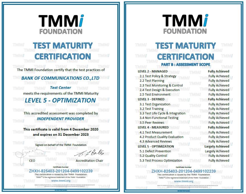TMMi認(rèn)證是當(dāng)前國際上最權(quán)威的測(cè)試組織成熟度認(rèn)證體系,也是軟件產(chǎn)品質(zhì)量管理水平最有力的資質(zhì)證明,最高級(jí)別為五級(jí)。此次獲得五級(jí)認(rèn)證,標(biāo)志著交行的軟件測(cè)試能力、產(chǎn)品質(zhì)量管理水平、風(fēng)險(xiǎn)應(yīng)對(duì)能力、測(cè)試過程改進(jìn)能力、測(cè)試技術(shù)創(chuàng)新能力的整體成熟度均已達(dá)到國際領(lǐng)先水平。