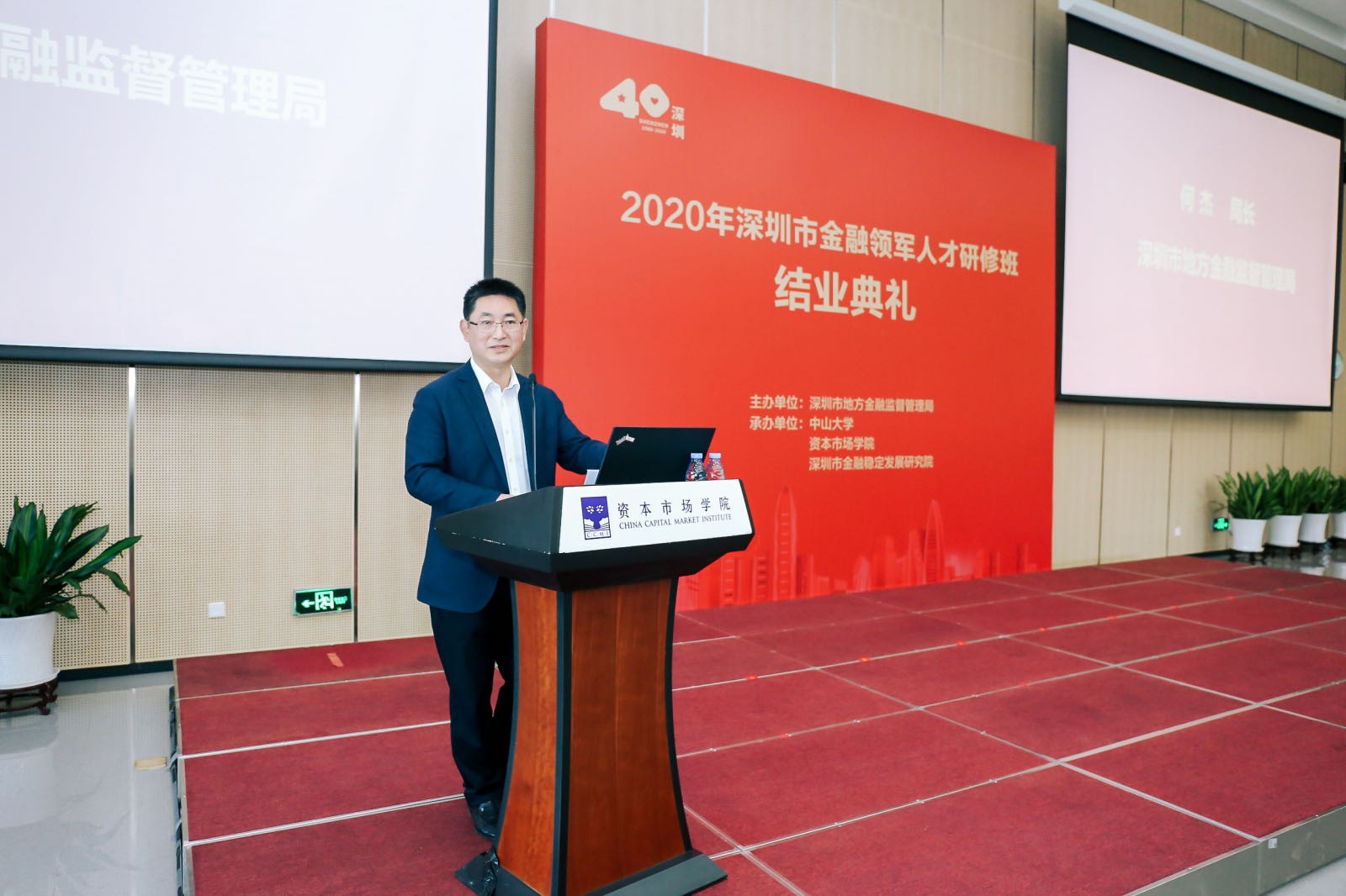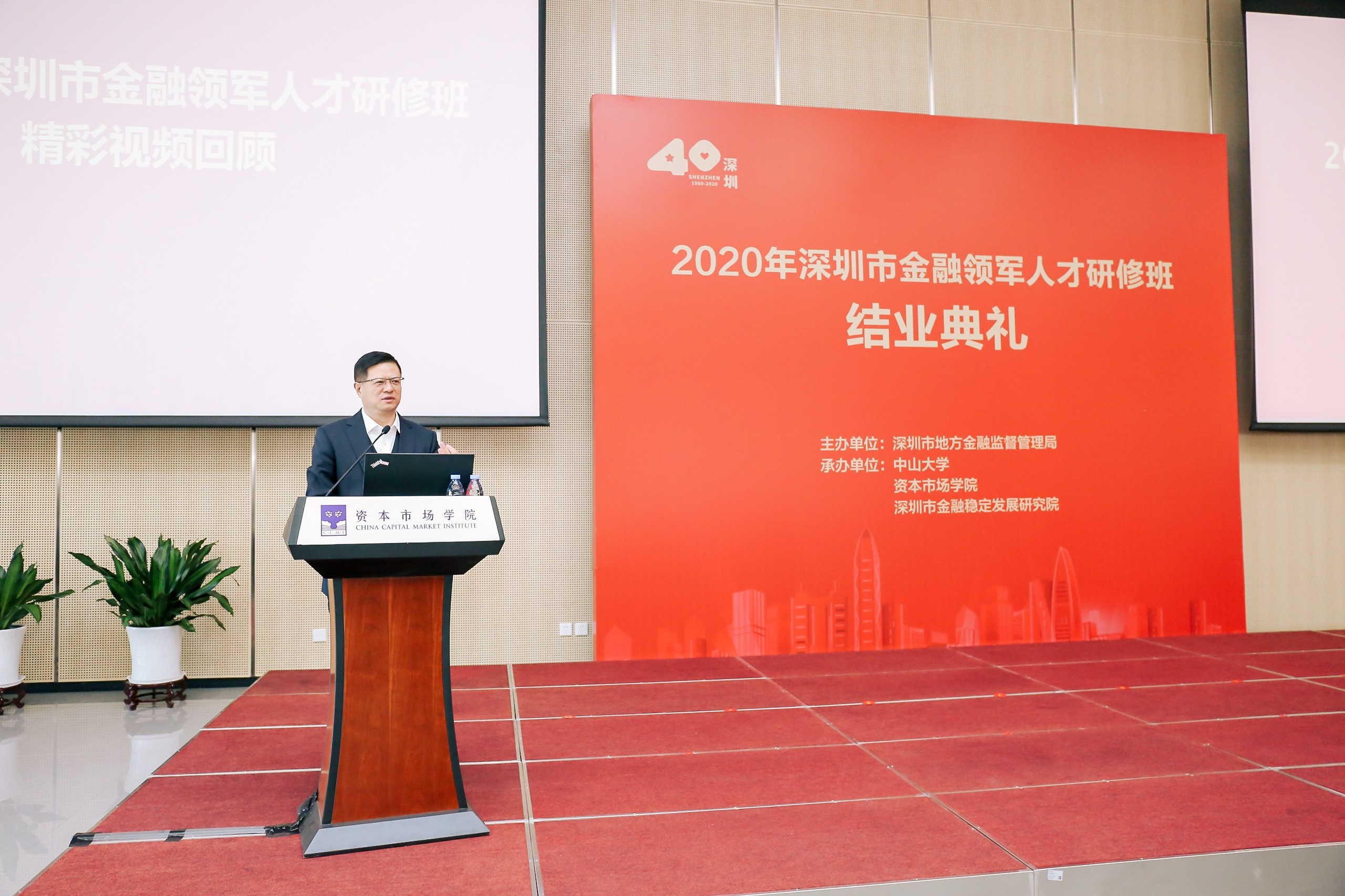 1月30日上午,2020年深圳金融領(lǐng)軍人才研修班結(jié)業(yè)典禮在資本市場學院隆重舉辦。本期研修班由深圳市地方金融監(jiān)督管理局主辦,中山大學、資本市場學院、深圳市金融穩(wěn)定發(fā)展研究院共同承辦。市地方金融監(jiān)管局黨組書記劉平生主持結(jié)業(yè)典禮并致辭,局長何杰作總結(jié)講話。資本市場學院副理事長、深圳市原副市長唐杰教授,資本市場學院黨委書記陳自強、院長金立揚、副院長張韶輝,深圳銀保監(jiān)局副局長陳飛鴻、深圳證券交易所紀委書記邢力紅,市地方金融監(jiān)督管理局副巡視員林居正,中山大學嶺南學院院長陸軍教授,以及市委組織部、人民銀行深圳市中心支行、深圳證監(jiān)局有關(guān)領(lǐng)導(dǎo)應(yīng)邀出席,本期研修班近110名學員參加活動。