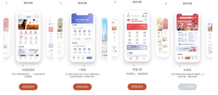 中信銀行app可以自行選擇最適合自己的版本,除了標(biāo)準(zhǔn)版之外,還有針對出國金融、小微,以及適合老人、軍人、海外、私人銀行等版本。