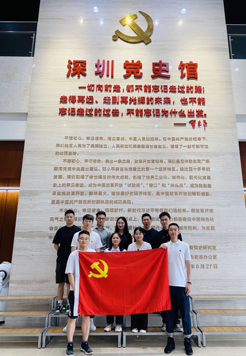 離開陵園,浦發(fā)銀行深圳分行的黨員們在深圳黨史館向青年員工介紹了深圳地區(qū)在中國共產(chǎn)黨領(lǐng)導(dǎo)下進行革命、建設(shè)和改革的不懈奮斗史以及取得的輝煌成就。大家一起在黨史館門口誦讀,“一切向前走,都不能忘記走過的路;走得再遠、走到再光輝的未來,也不能忘記走過的過去,不能忘記為什么出發(fā)”。