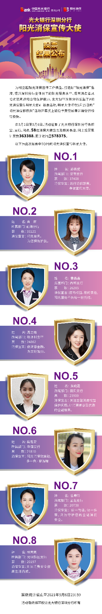 深圳新聞網(wǎng)·見圳客戶端2021年5月8日訊 昨日,光大銀行深圳分行“陽光消保宣傳明星大使”線上投票圓滿結(jié)束,從58名宣傳大使中投票產(chǎn)生了賴春妮、肖雨、曹晶晶、周之靖、黃曉霞、蔣易萱、曾粵玲、林思思8名陽光消保宣傳明星大使。明星大使將在5月15日的“陽光消保健康跑”活動開幕式上被授予榮譽勛章并接受行領(lǐng)導(dǎo)授旗。5月1日,光大銀行深圳分行發(fā)起了“陽光消保宣傳明星大使”線上投票,旨在樹立起陽光消保宣傳工作典型,打造“陽光消?!逼放疲嵘钲诜中腥w員工的陽光服務(wù)水平,提高消費者風(fēng)險防范意識和自我保護能力,提升光大在深圳地區(qū)的品牌影響力。投票活動得到社會熱烈響應(yīng),據(jù)統(tǒng)計,此次累計票數(shù)達363388次。