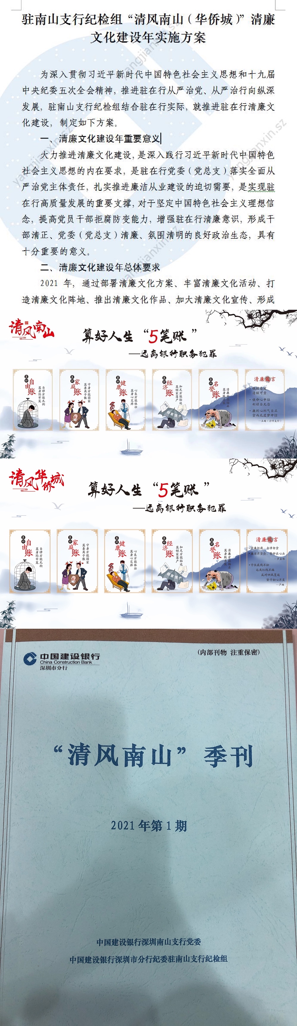 深圳新聞網(wǎng)6月9日訊 為充分發(fā)揮清廉文化的教育、激勵、凝聚、導向和約束作用,響應(yīng)深圳銀行業(yè)保險業(yè)清廉金融文化核心理念,積極培育厚德養(yǎng)廉的政治生態(tài),著力助推駐在行干部清正、黨委清廉、政治清明、生態(tài)清朗的清廉文化建設(shè),近日,建行深圳市分行駐南山支行紀檢組制定推出了《“清風南山(華僑城)”清廉文化建設(shè)年實施方案》。該方案以“6講”為依托,明確清廉文化建設(shè)5大任務(wù),即:弘揚清廉價值理念、豐富清廉文化活動、打造清廉文化陣地、推出清廉文化作品、攜手清廉文化共建。