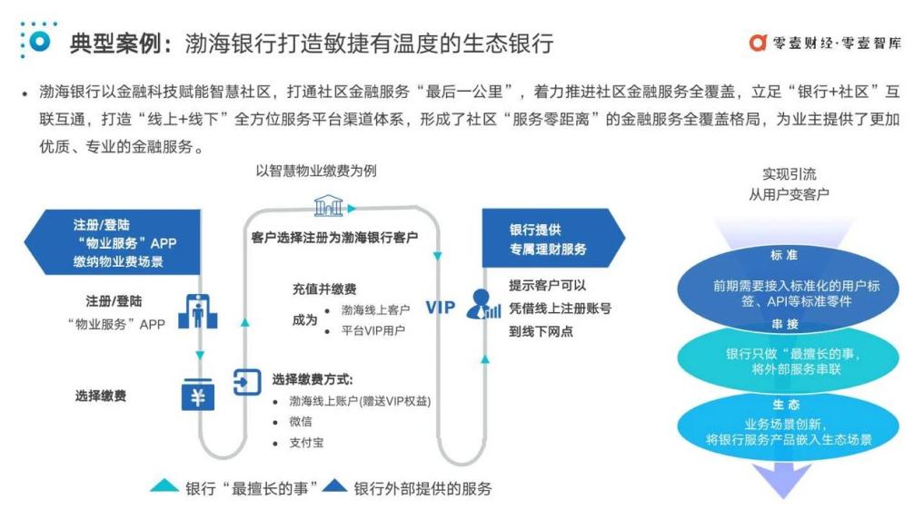 以此次該行入圍行業(yè)權(quán)威報(bào)告的“智慧物業(yè)”金融科技創(chuàng)新服務(wù)項(xiàng)目為例,渤海銀行創(chuàng)新業(yè)務(wù)場(chǎng)景——繳納物業(yè)費(fèi)場(chǎng)景,社區(qū)居民通過(guò)“物業(yè)服務(wù)APP”繳納物業(yè)費(fèi)時(shí),可以選擇渤海銀行線(xiàn)上賬戶(hù)為付費(fèi)方式,當(dāng)用戶(hù)充值并繳費(fèi)后,便同時(shí)成為了渤海銀行線(xiàn)上客戶(hù)和平臺(tái)V IP,并享受銀行提供的專(zhuān)屬理財(cái)服務(wù)。通過(guò)將自身服務(wù)產(chǎn)品嵌入“物業(yè)服務(wù)”A PP,只做“最擅長(zhǎng)的事,渤海銀行將外部服務(wù)串聯(lián)”,最終實(shí)現(xiàn)A PP用戶(hù)到自身客戶(hù)的轉(zhuǎn)變。