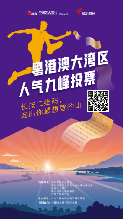 近日,“2021粵港澳大灣區(qū)全民登高系列賽”已經(jīng)進(jìn)入啟動(dòng)階段,現(xiàn)已在網(wǎng)上發(fā)起粵港澳大灣區(qū)人氣九峰的投票,通過各大網(wǎng)友從29座粵港澳大灣區(qū)山峰中票選出九座人氣最高的山峰,作為本次全民登高系列賽線上賽的主要場(chǎng)地,并在其中一座山峰舉行線下賽事活動(dòng)。廣大市民朋友可通過掃描圖中二維碼進(jìn)行投票。