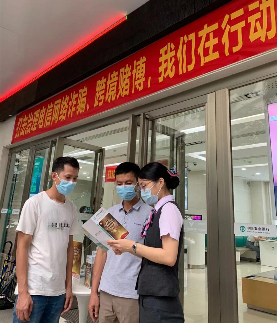 農(nóng)行深圳分行以點帶面,發(fā)揮銀行網(wǎng)點宣傳陣地的優(yōu)勢,員工向前來辦理業(yè)務(wù)的群眾普及基本防騙知識,進(jìn)一步提升防騙宣傳的影響力和覆蓋面。張貼“反詐拒賭,安全支付”等警示語橫幅、醒目區(qū)域擺放金融安全知識學(xué)習(xí)海報、向到訪客戶派發(fā)防金融詐騙宣傳折頁、協(xié)助客戶下載注冊“國家反詐中心”APP、網(wǎng)點現(xiàn)場開展金融反詐宣講會等一系列宣傳工作有序地、滲透式地在農(nóng)行各大網(wǎng)點開展著,成為提升全民金融風(fēng)險防范意識教育的重要抓手。