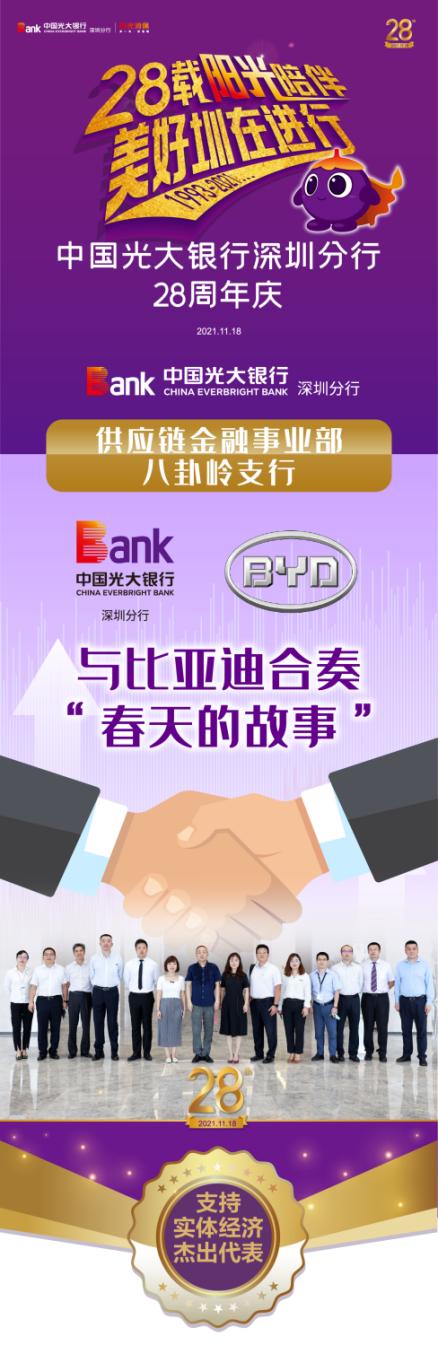 作為光大銀行深圳分行首批成立的支行之一,八卦嶺支行是服務(wù)比亞迪的“第一線”。一個個服務(wù)實體經(jīng)濟(jì)、相伴成長的動人故事,成為八卦嶺支行代代相傳的寶貴財富。在深圳分行28周年“十大最美光陰故事”評選中,供應(yīng)鏈金融事業(yè)部與八卦嶺支行榮獲支持實體經(jīng)濟(jì)杰出代表。
