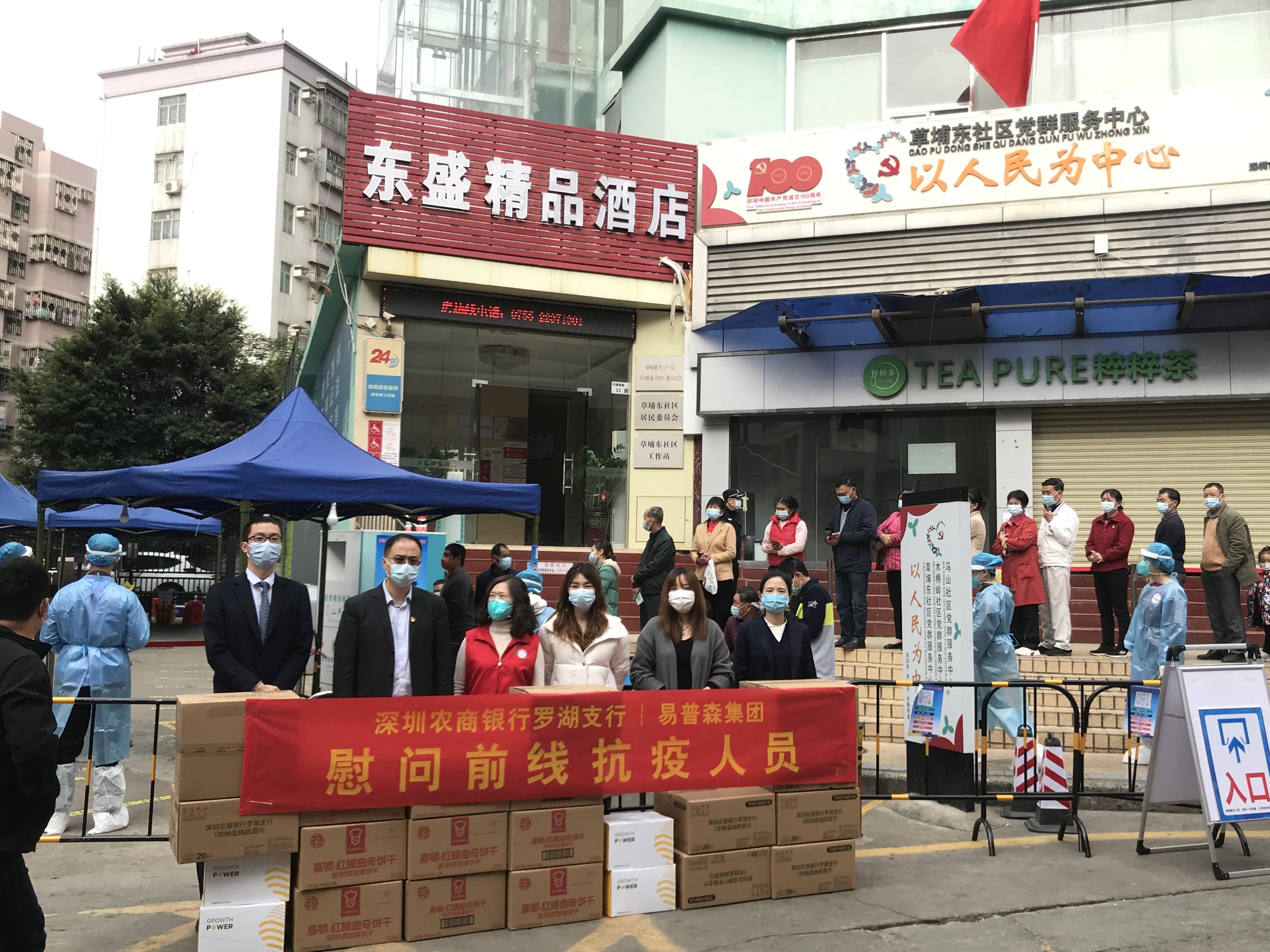 此次慰問(wèn)活動(dòng)的開展也得到了深圳農(nóng)商銀行羅湖支行企業(yè)客戶的積極響應(yīng)。易普森集團(tuán)、深圳市富寶東門市場(chǎng)管理有限公司在獲悉深圳農(nóng)商銀行此次活動(dòng)后,積極響應(yīng),表示要為羅湖區(qū)做一份貢獻(xiàn),于是與該行攜手為羅湖區(qū)前線抗疫人員送去物資和問(wèn)候。