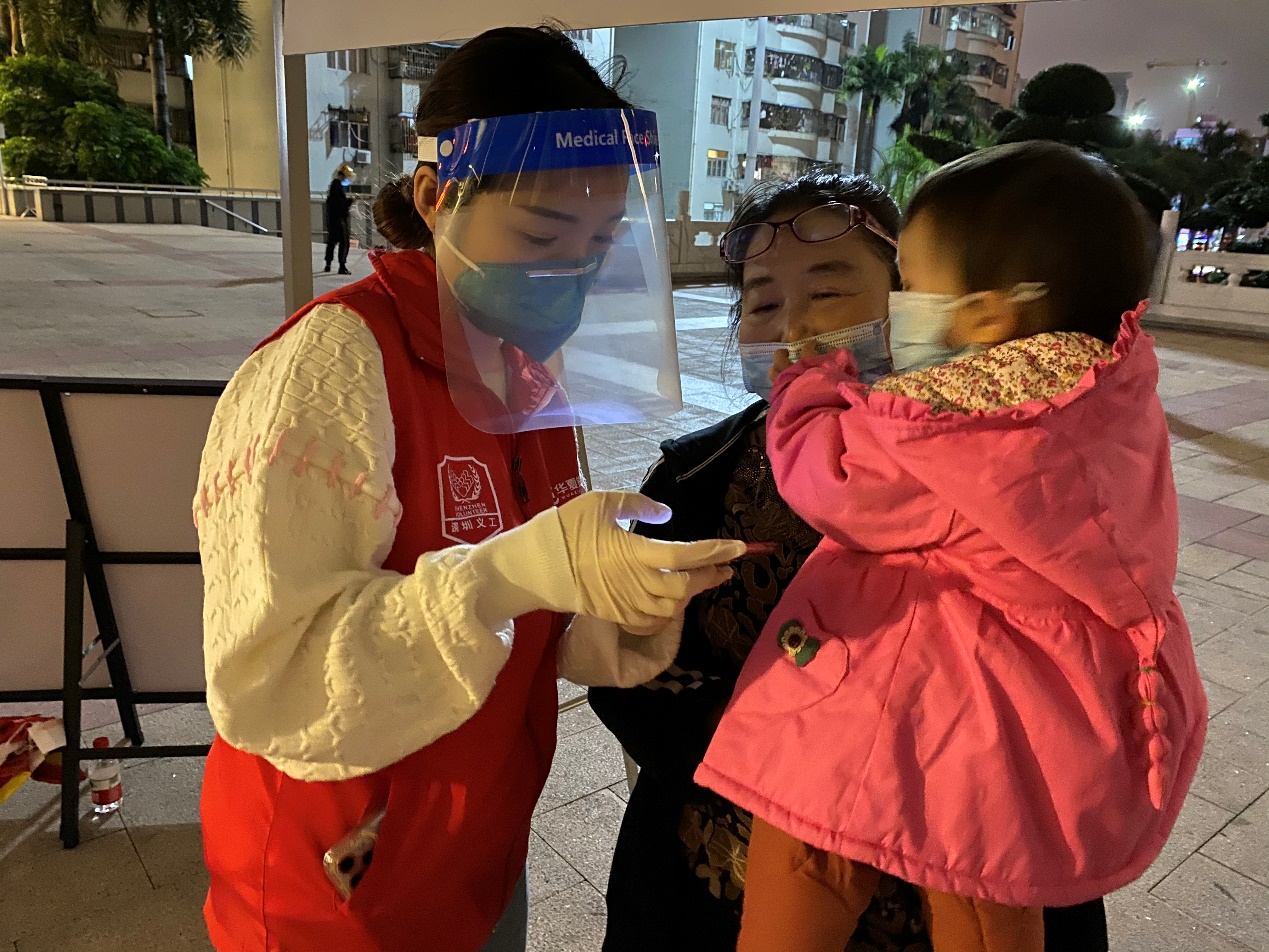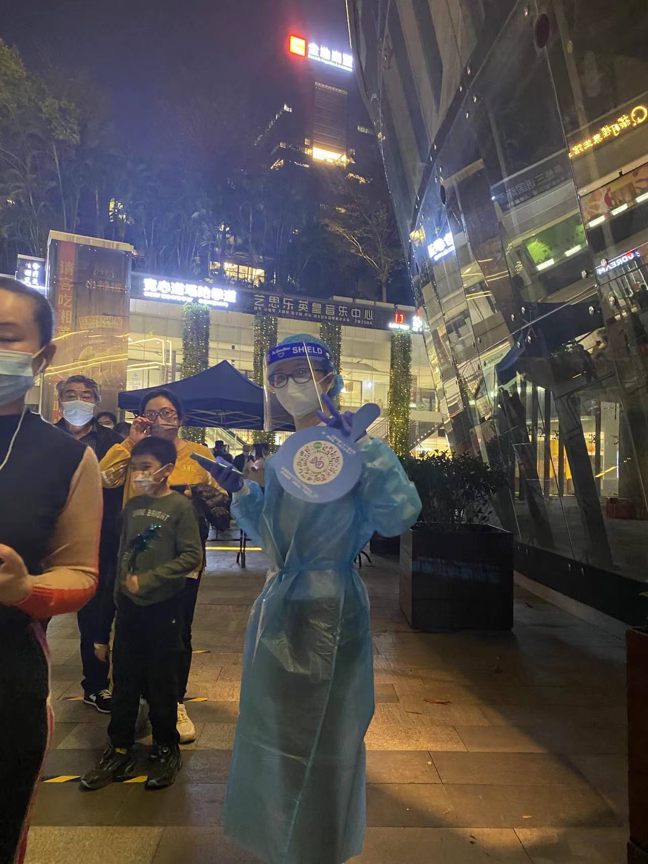 面對(duì)本輪疫情的來(lái)勢(shì)洶洶,新增病例的數(shù)字每天都在持續(xù)增加,許多小區(qū)開(kāi)始封閉管理。在管控小區(qū)檢測(cè)點(diǎn)志愿者奇缺的狀況下,華夏銀行深圳蛇口支行的李宇航迅速報(bào)名成為社區(qū)義工。很快,他就穿著防護(hù)服,在封閉式管理的小區(qū)內(nèi)幫助核酸檢測(cè)秩序維護(hù)、指導(dǎo)粵核酸操作。他還主動(dòng)承擔(dān)檢測(cè)物資運(yùn)送的工作,小朋友們總是跑到圍欄外喊他“大白”。他背對(duì)著孩子們,自豪地說(shuō):“我是華夏小李!”
