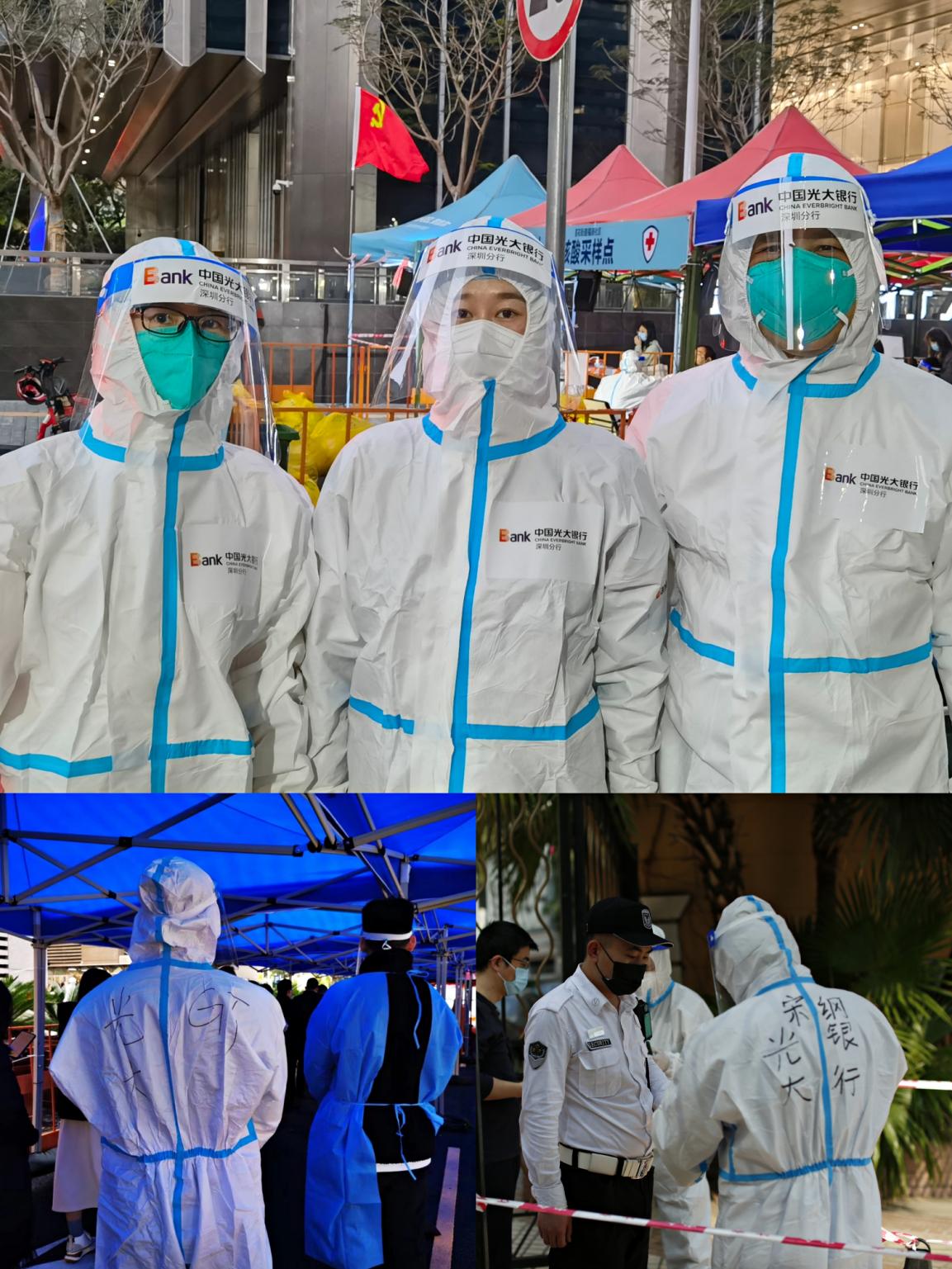 在疫情防控的關(guān)鍵時期,深圳分行黨委堅決貫徹落實當(dāng)?shù)卣姆揽匾?,分行黨委書記、行長韓學(xué)智同志緊急召開黨委會議,啟動應(yīng)急預(yù)案,積極部署并投入疫情防控工作,確保日常營運和客戶服務(wù)等工作有序運轉(zhuǎn)。在深圳福田區(qū)金融工作局的組織與號召下,分行黨委要求全體黨員干部發(fā)揮先鋒模范作用,主動為社區(qū)疫情防控工作提供志愿服務(wù)。分行黨委委員們率先垂范,分頭帶領(lǐng)黨員干部奔赴社區(qū)慰問抗戰(zhàn)一線工作人員,并犧牲周末休息時間深入社區(qū)核酸采樣點,脫下西裝變身“大白”。深圳分行各黨支部和團支部先后組織開展各類志愿服務(wù)累計時長超過100小時,活躍在防疫抗疫一線的同志們在全力保障廣大群眾金融服務(wù)需求的同時,和醫(yī)護工作者一同守護著千家萬戶。作為集團駐深企業(yè)協(xié)同工作的牽頭單位,分行牽頭組建駐深企業(yè)志愿者先鋒隊,緊急投身福田區(qū)抗擊疫情的各個戰(zhàn)線和各個角落,不分晝夜、不論疲倦、以實際行動踐行初心、使命和擔(dān)當(dāng),弘揚新時代共產(chǎn)黨人的奉獻精神?!叭绻皇怯H身體驗志愿者服務(wù)工作,永遠不知道抗疫人員的工作是如此辛苦!有多少人在負重前行才確保了深圳市民有序和安寧的生活。此刻很想擁抱可親可敬的你們,防護服雖然阻擋了我們的擁抱,但無法阻擋我們一起抗擊疫情的心?!币晃恢驹刚哌@樣記錄到。
