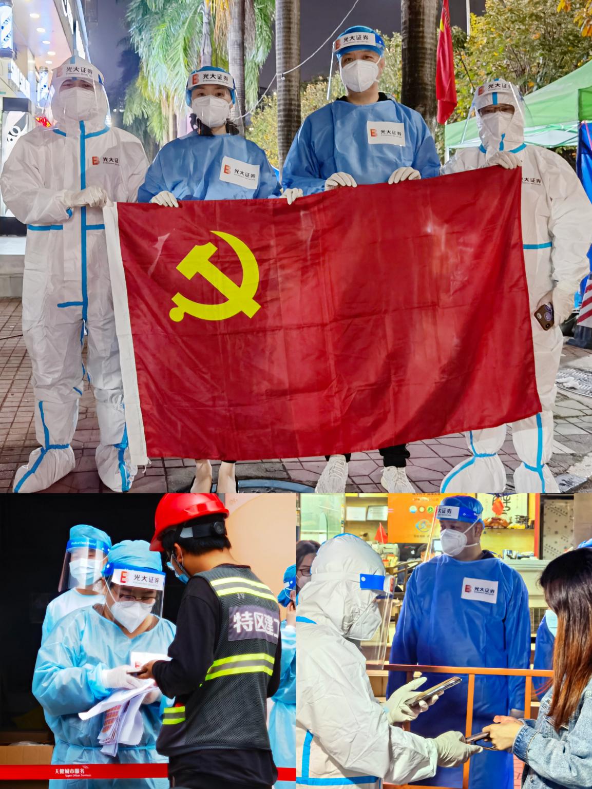 光大證券深圳分公司發(fā)揮基層黨組織戰(zhàn)斗堡壘作用和黨員先鋒模范作用,黨員干部迅速牽頭組建了“光證深分先鋒隊”,下沉基層抗疫一線,黨員同志們換上防護服、手套和隔離面罩深入蓮花街道多個社區(qū),全力協(xié)助醫(yī)護人員做好核酸檢測的輔助工作。從白天到黑夜的堅守,頂著溫差很大的深夜寒風(fēng),保持良好狀態(tài),為廣大群眾的身體健康安全提供了有力保障。一句句暖心的提示、一個個忙碌的身影,光大證券深圳分公司的志愿者們,用實際行動,堅定地守護著鵬城的人們!