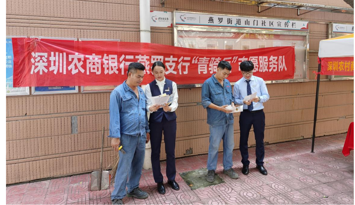 深圳新聞網(wǎng)2024年10月10日訊(記者 朱琳 通訊員 張士杰 稅奧)在深圳這座充滿(mǎn)活力的現(xiàn)代化都市中,金融的脈動(dòng)與城市的繁榮緊密相連。作為扎根深圳70余年的本土金融機(jī)構(gòu),深圳農(nóng)商銀行積極踐行使命擔(dān)當(dāng),在常態(tài)化的金融知識(shí)普及之外,通過(guò)各分支行的“青騎兵”志愿服務(wù)項(xiàng)目,將金融知識(shí)傳遞到城市的各個(gè)角落,協(xié)助提高市民金融素養(yǎng),增強(qiáng)防范意識(shí)與權(quán)益保障能力,為構(gòu)建安全、穩(wěn)定、健康的金融生態(tài)環(huán)境貢獻(xiàn)力量。