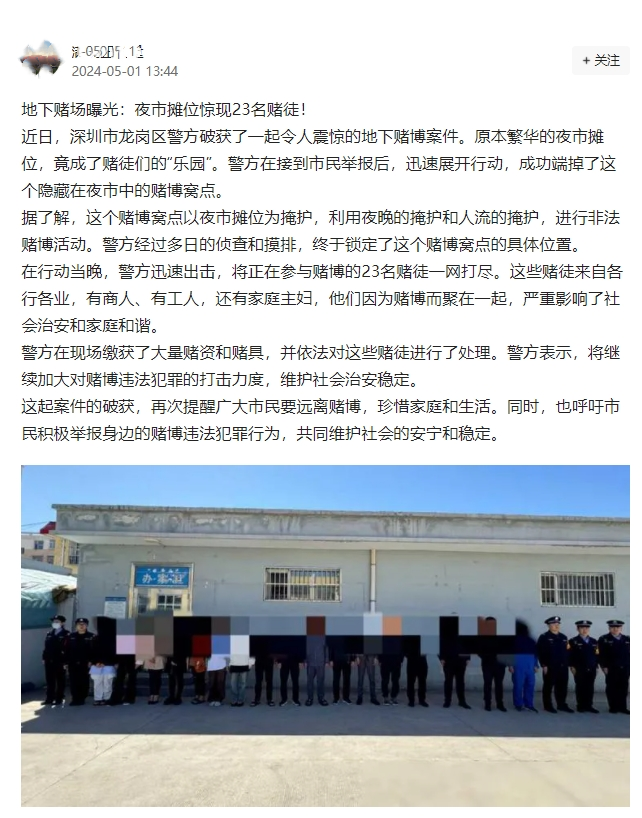 有網(wǎng)民在某社交平臺發(fā)帖稱:“近日,深圳市龍崗區(qū)破獲了一起令人震驚的地下賭博案件。原本繁華的夜市攤位,竟成了賭徒們的‘樂園’?!饼垗弲^(qū)相關(guān)部門第一時間對該內(nèi)容進行核查,確認(rèn)此消息不實,龍崗區(qū)沒有發(fā)生此類案件。